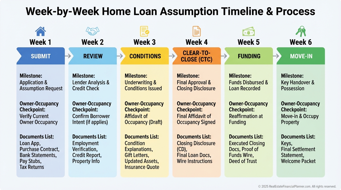 Weeks 1–2: Execute the contract, submit a complete assumption package within 24–48 hours, and open title with an assumption-savvy closer.