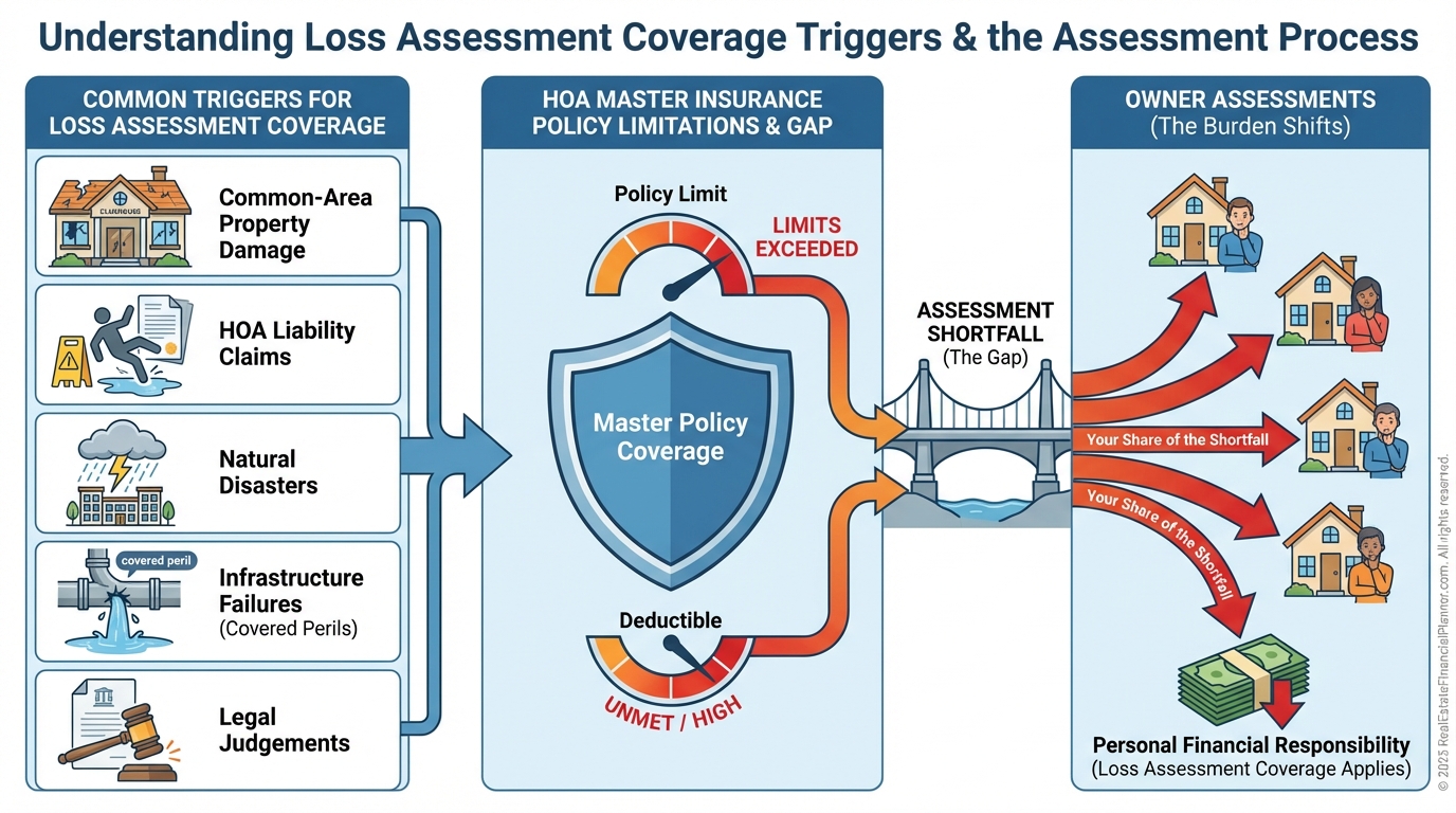 Loss assessment coverage pays your share when the HOA assesses owners for property damage or liability claims that exceed the master policy or fall under its deductible.