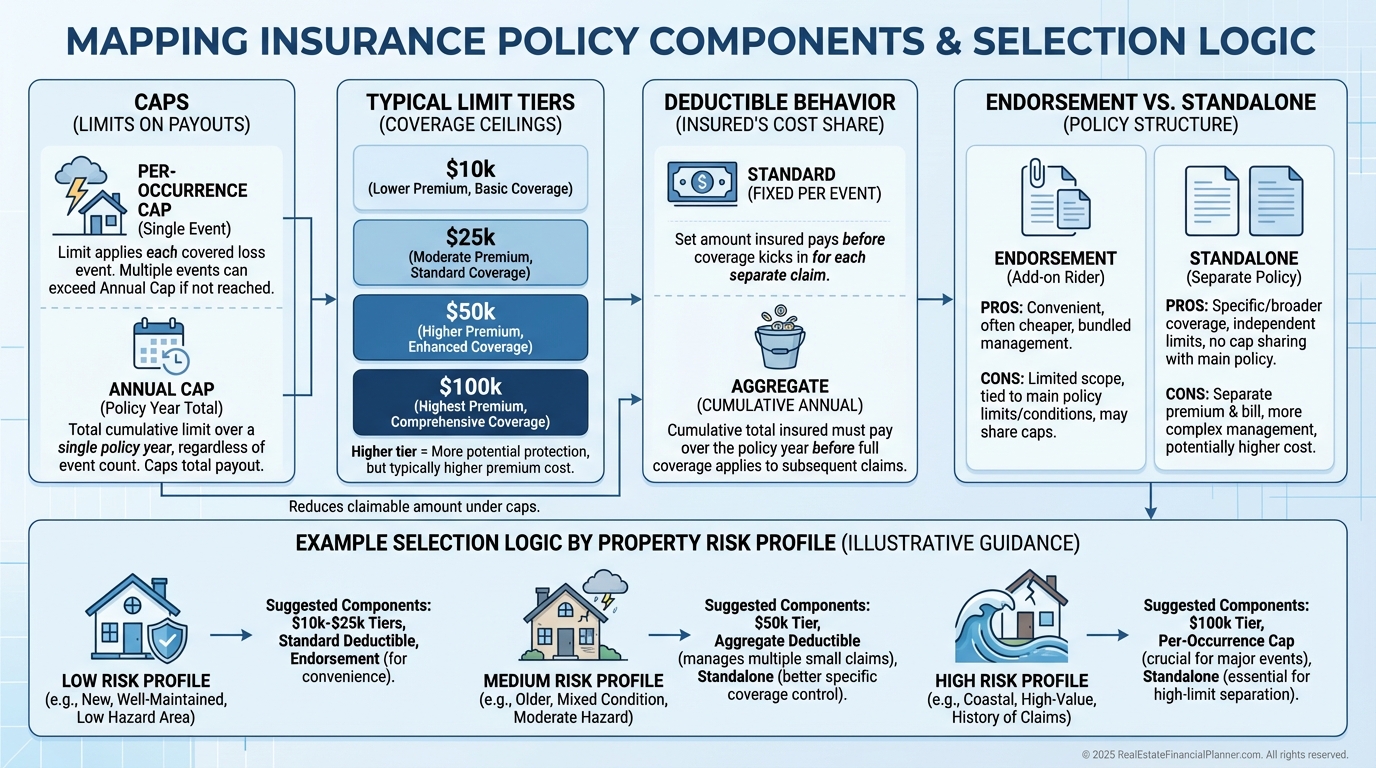Check whether limits are per occurrence and whether there’s an annual cap. In storm-prone areas, I avoid tight annual caps.