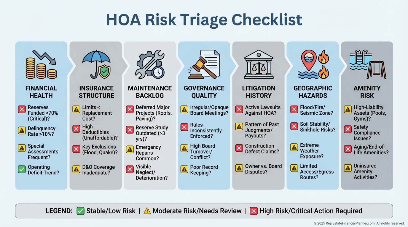Financial: reserves below 10% of annual budget, no recent reserve study, high delinquencies, or repeated special assessments.