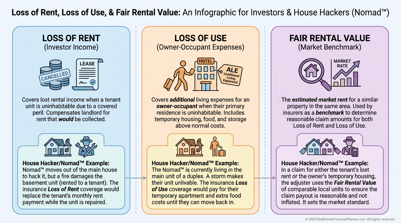 If you’re house hacking or doing a Nomad™ move-in strategy, you may need both: loss of use for your unit and loss of rent for the tenant units.