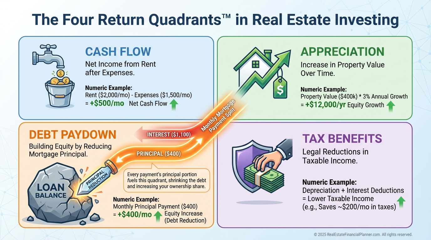 When I audit portfolios, I plot cash flow, appreciation, principal reduction, and tax benefits by property.