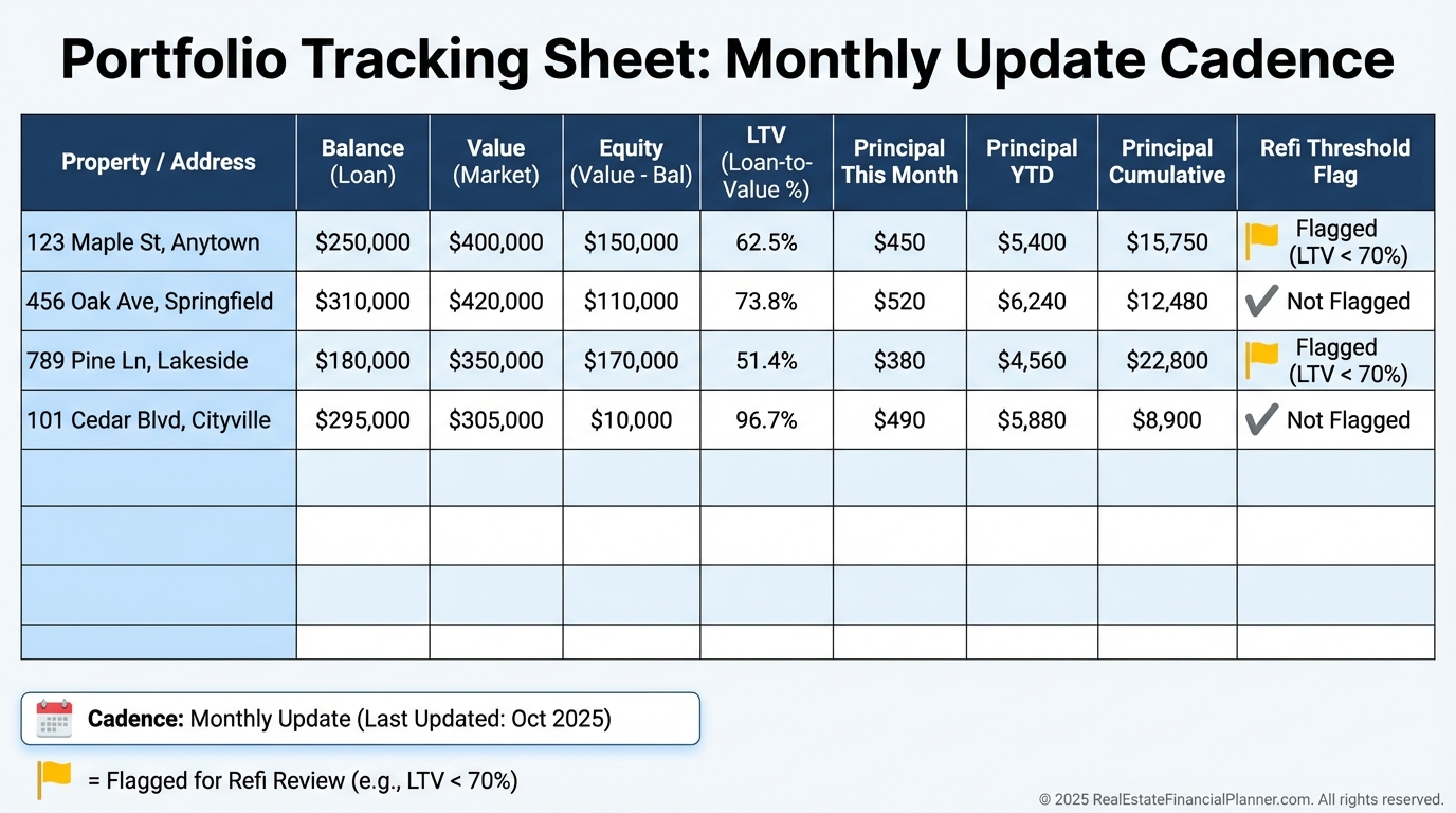 I color-code properties nearing refi thresholds like 75% LTV.