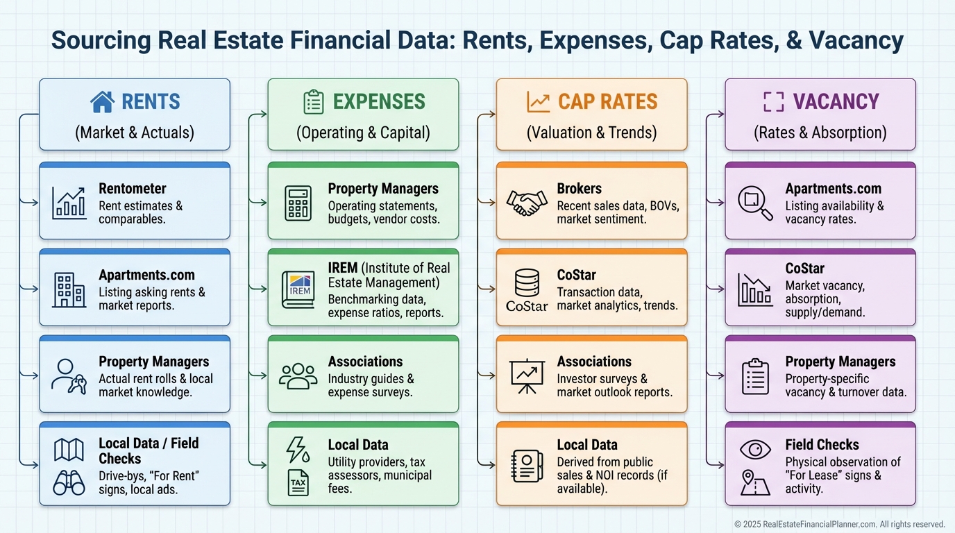 For cap rates, I call three active commercial brokers and ask for closed deals, not listings.