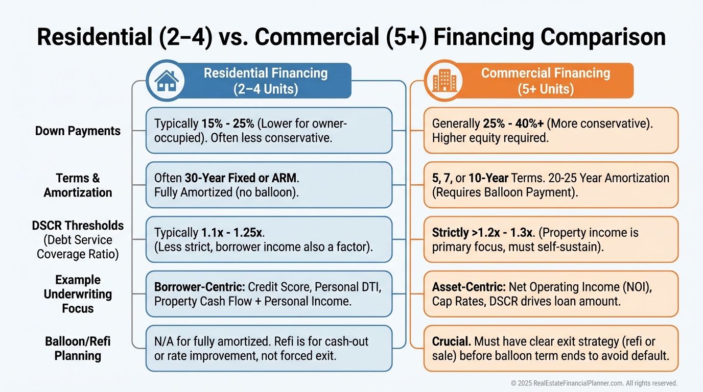 Commercial multifamily (5+ units) shifts everything to property income, DSCR, and shorter terms with balloons.