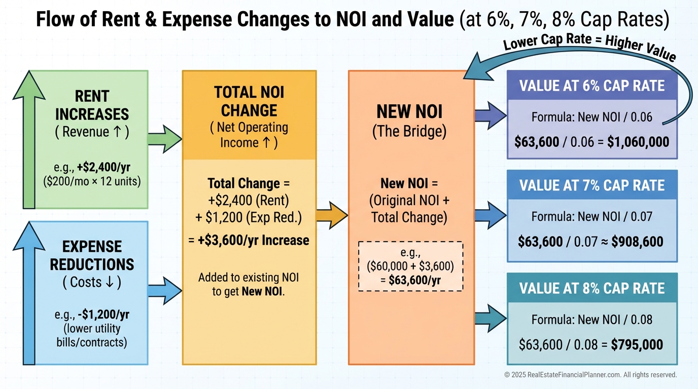 Every $1 of sustainable NOI growth multiplies into value at the cap rate.