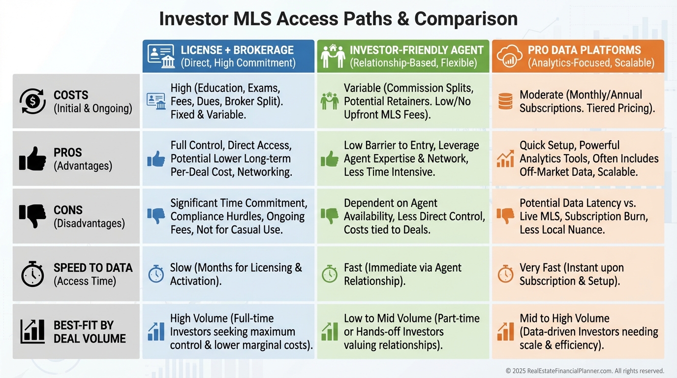 Get licensed for direct access. Work with an investor-friendly agent. Or use a professional platform that lawfully aggregates MLS with public records.