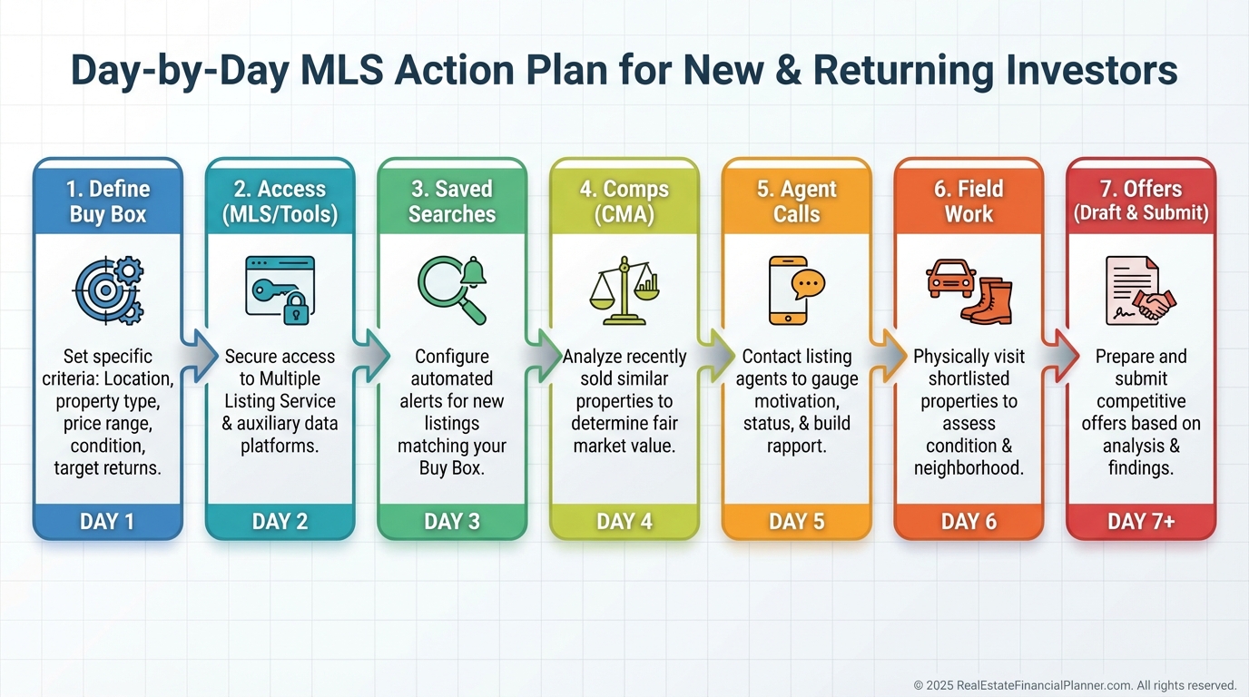 Day 1: Define your buy box. Price, neighborhoods, property type, condition, yield targets.