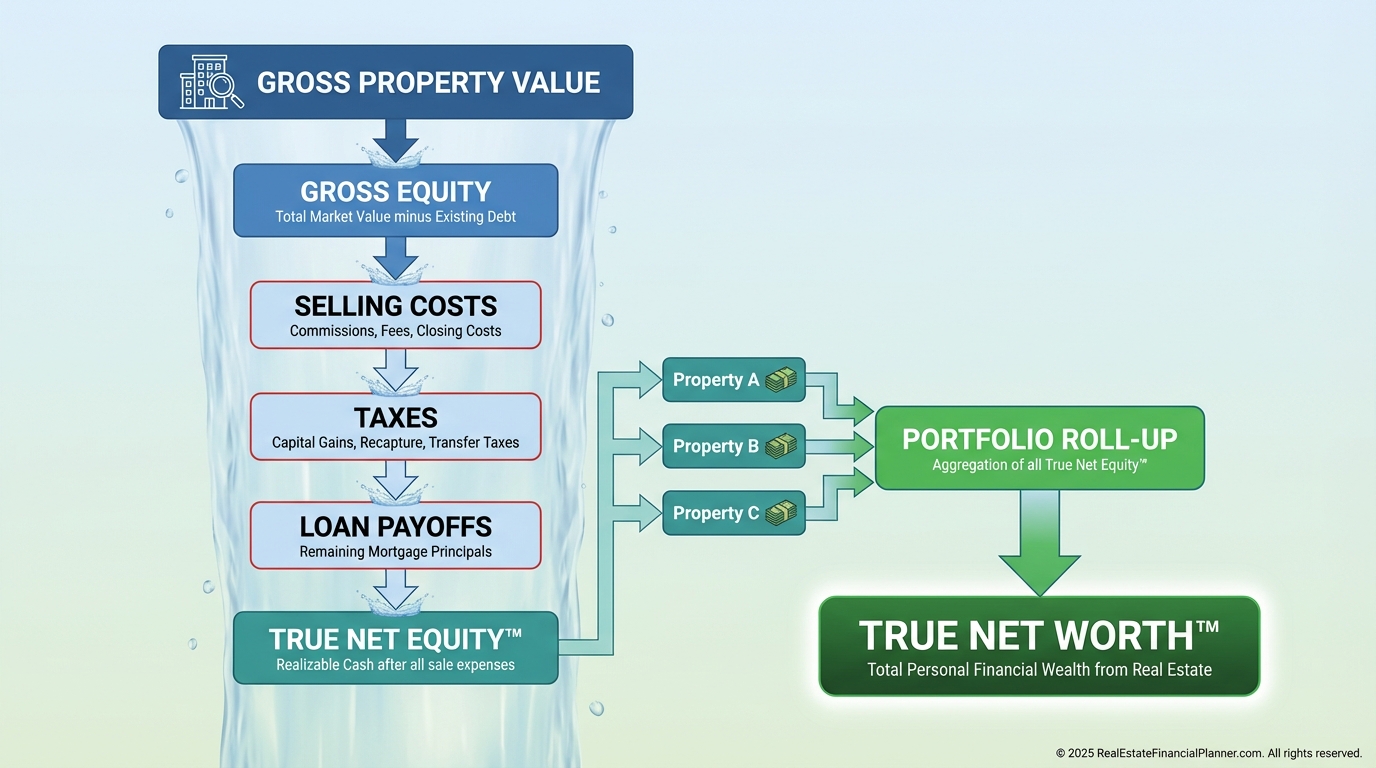 True Net Worth™ reduces each property’s equity by selling costs and taxes to get True Net Equity™, then rolls up.