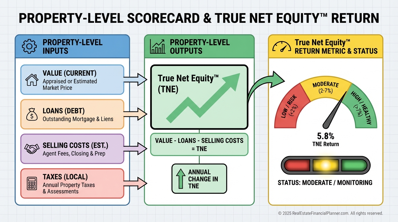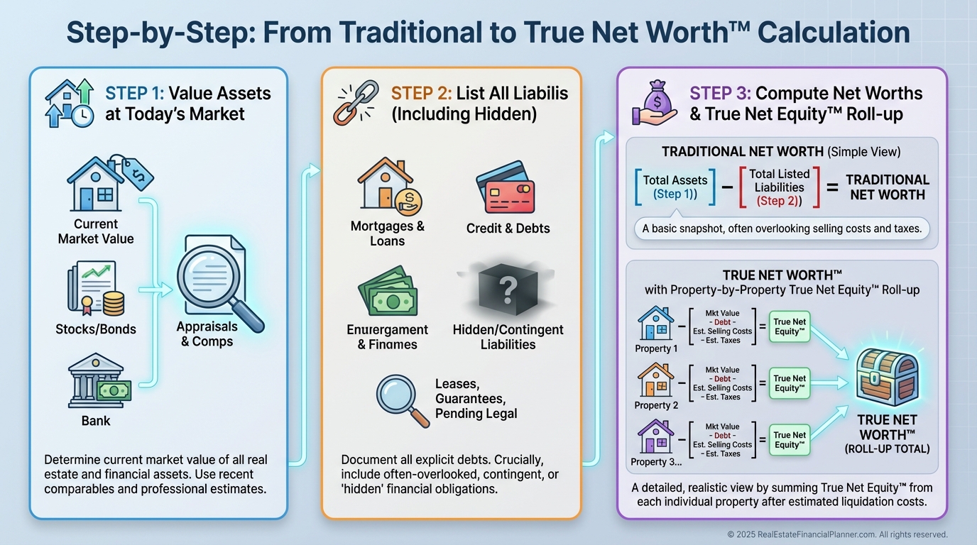 I coach clients to compute True Net Equity™ for each property first, then roll up to portfolio-level True Net Worth™.