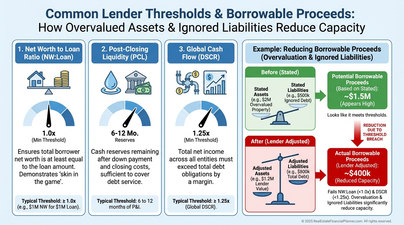 Commercial lenders may want net worth to exceed the loan by 25–50%, plus post-closing liquidity.