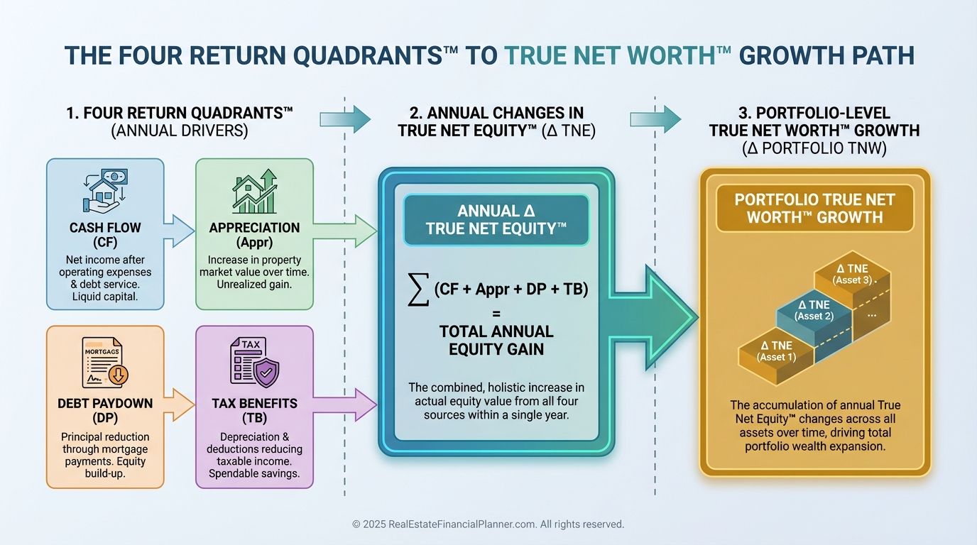 In Return Quadrants™, I show cash flow, appreciation, debt paydown, and tax benefits side-by-side with changes in True Net Equity™.