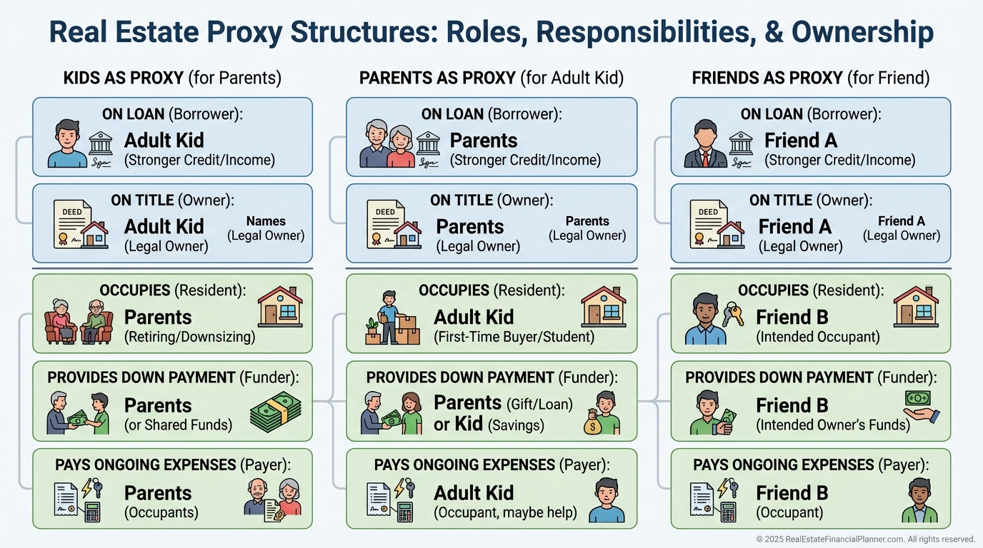The most common path is owner-occupant loans with your proxy as an occupying borrower. Better rates and lower down payments drive the math.