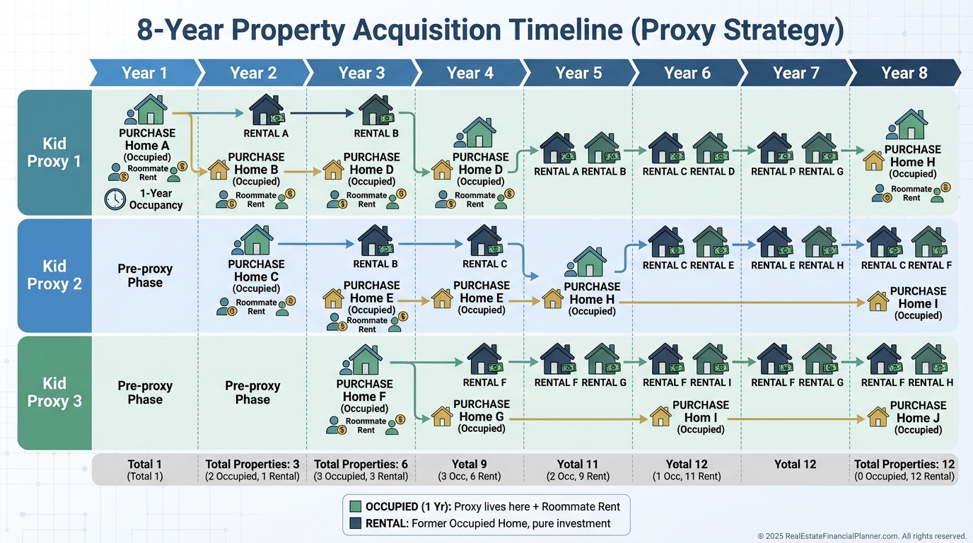 You still leverage owner-occupant financing and convert homes to rentals after at least one year, but a proxy lives in the property instead of you.