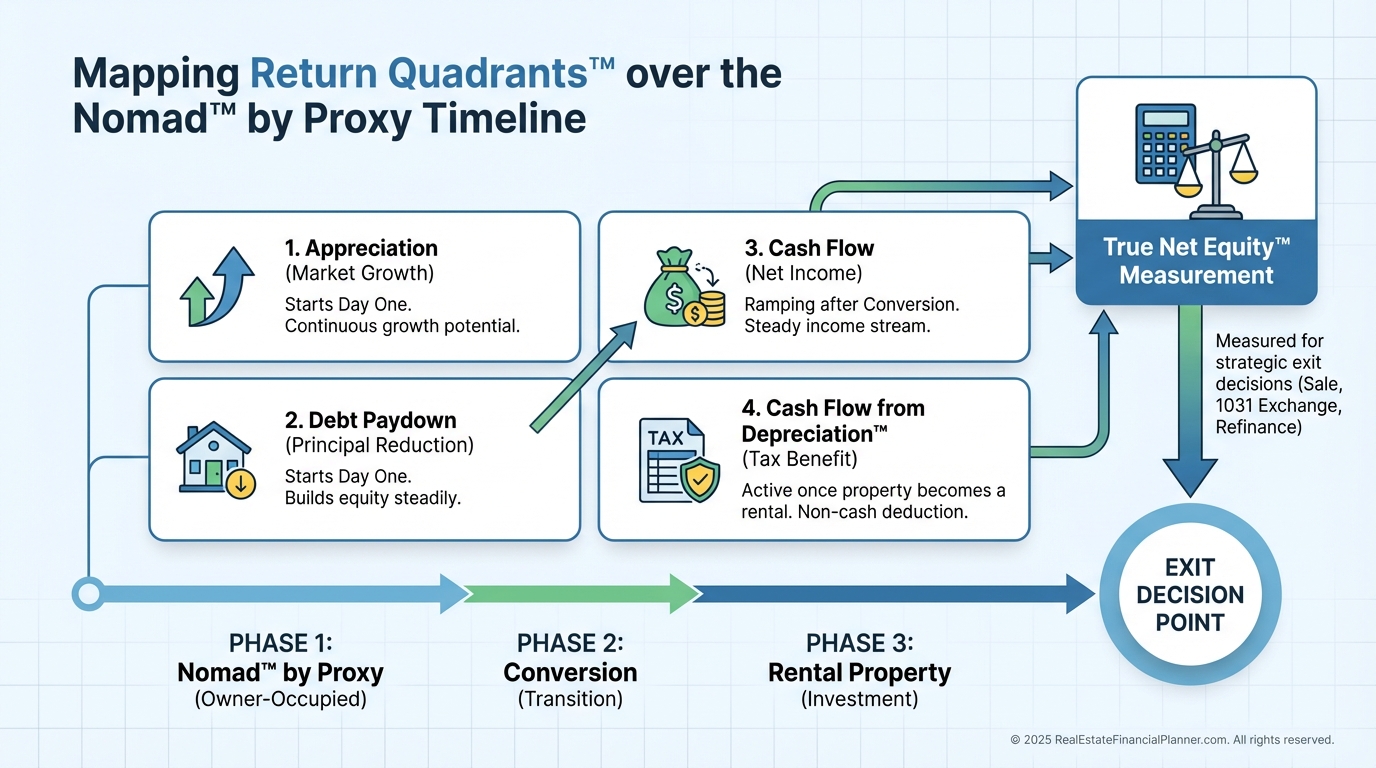 Most clients aim to hold long-term and let the Return Quadrants™ compound: appreciation, cash flow, debt paydown, and tax benefits.