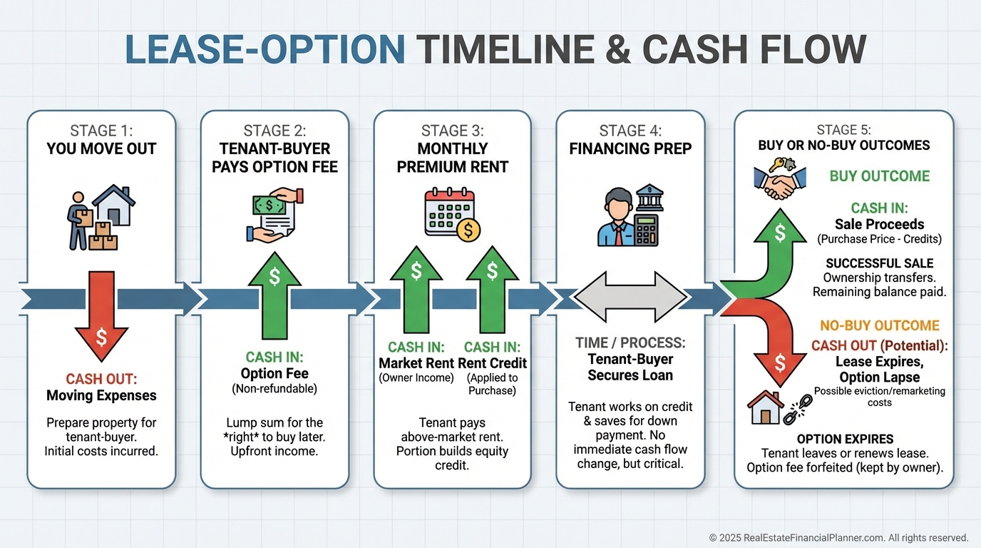 You collect a meaningful option fee before move-in, premium rent during the term, and a potential lump sum when they buy.