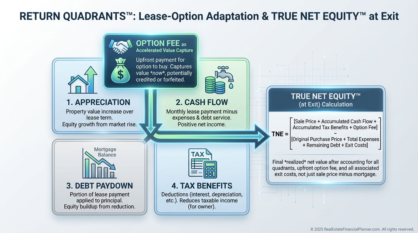 But it also pays you sooner and more often—option fees now, better cash flow during, and optimized True Net Equity™ at exit.