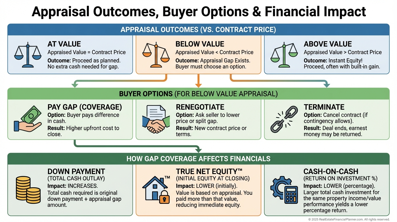 If value comes in low, you have three standard paths: pay the gap, renegotiate, or terminate if you kept the contingency.