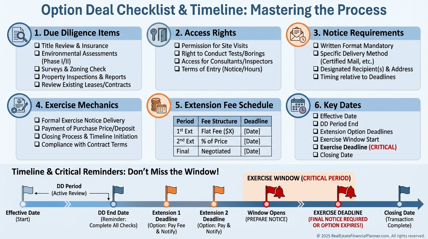 I keep option ledgers with dates, amounts, conditions, and notices because documentation wins disputes.