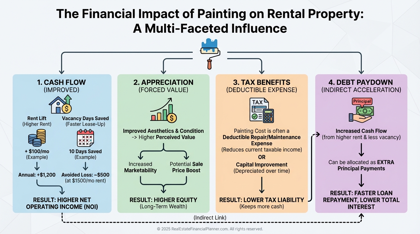 Cash Flow: paint can raise effective rent $25–$75 per month and cut 3–7 vacancy days with faster showings.