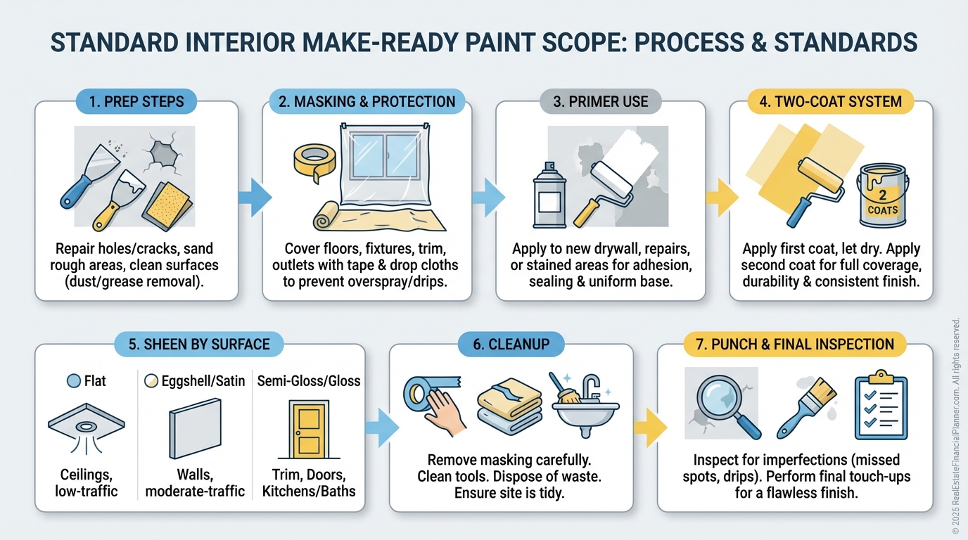 I spec a two-coat system on walls with spot-prime as needed, flat ceiling white, and semi-gloss trim/doors for cleanability.