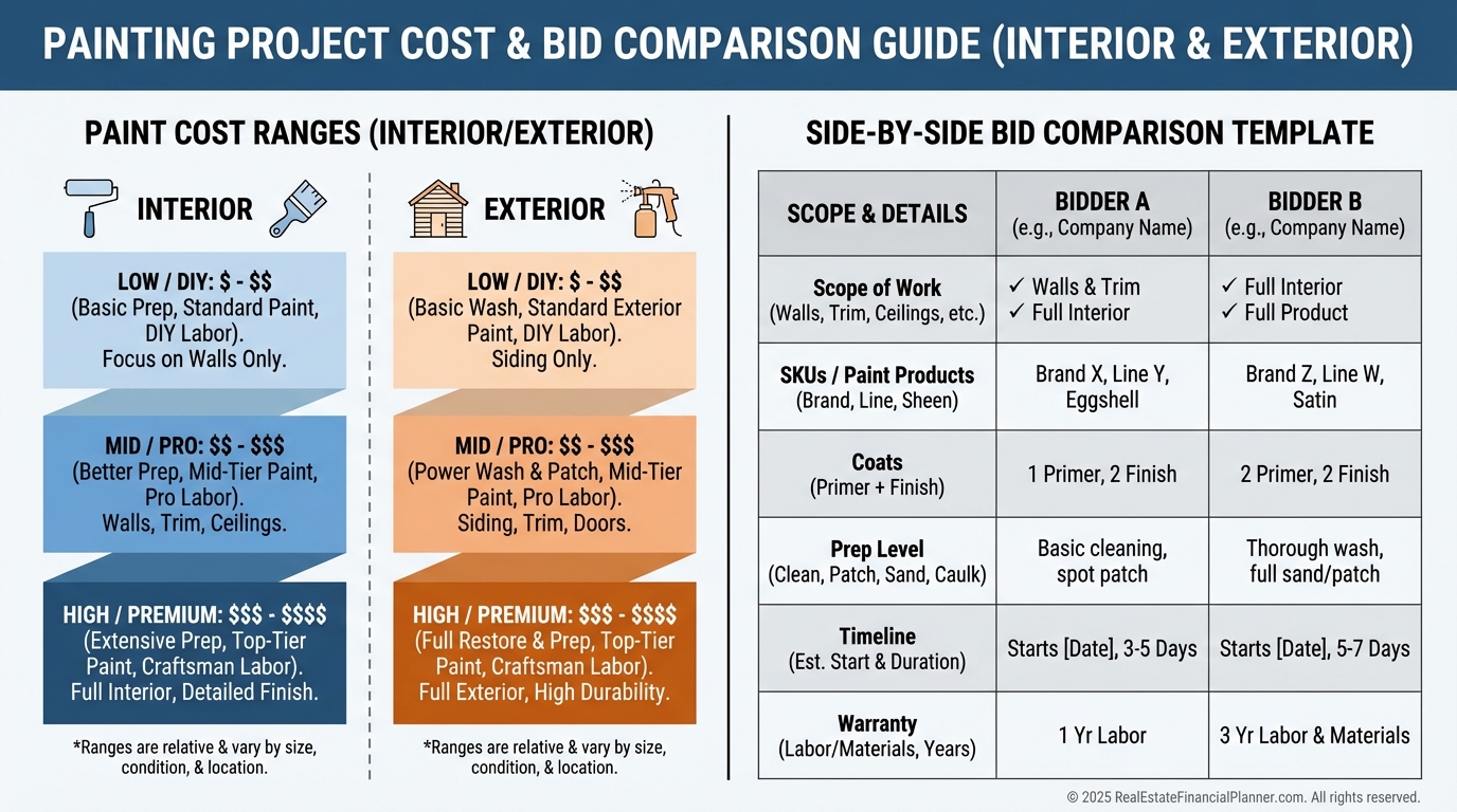 Always collect three apples-to-apples bids with the same scope, SKUs, coat counts, and warranty.