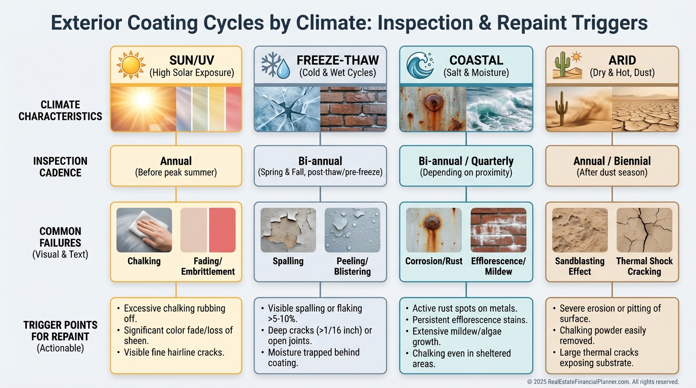 Inspect exteriors twice a year and plan partial repaints by elevation.