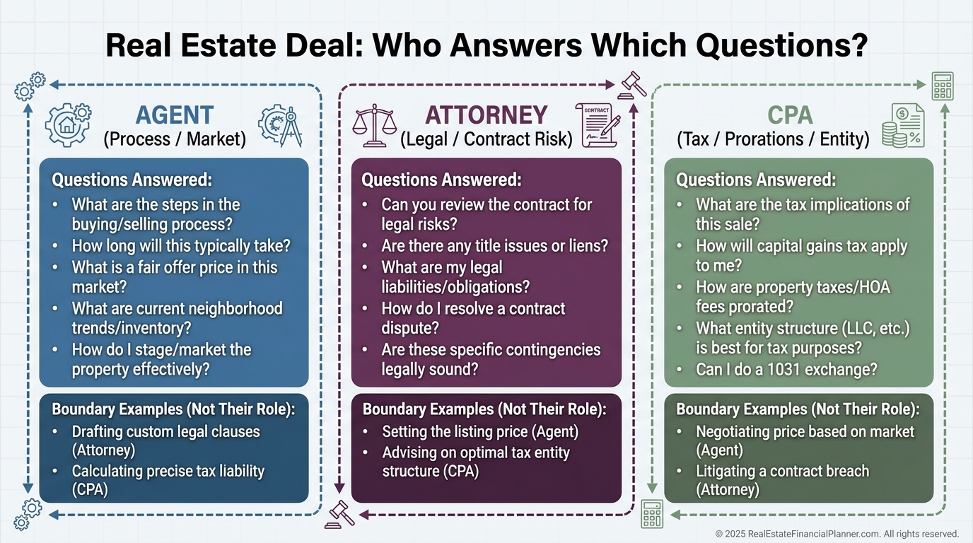 Your agent can explain process and standard practice. For legal interpretation or strategy, I loop in your attorney.