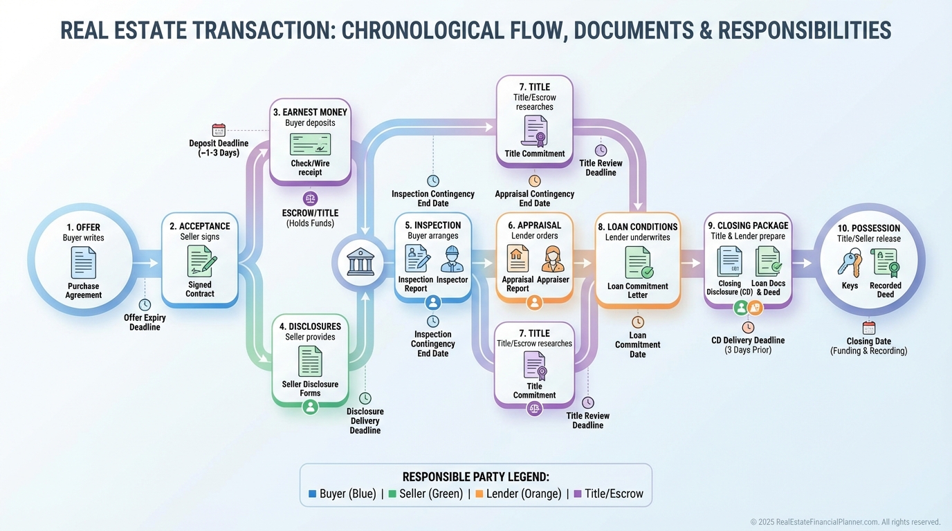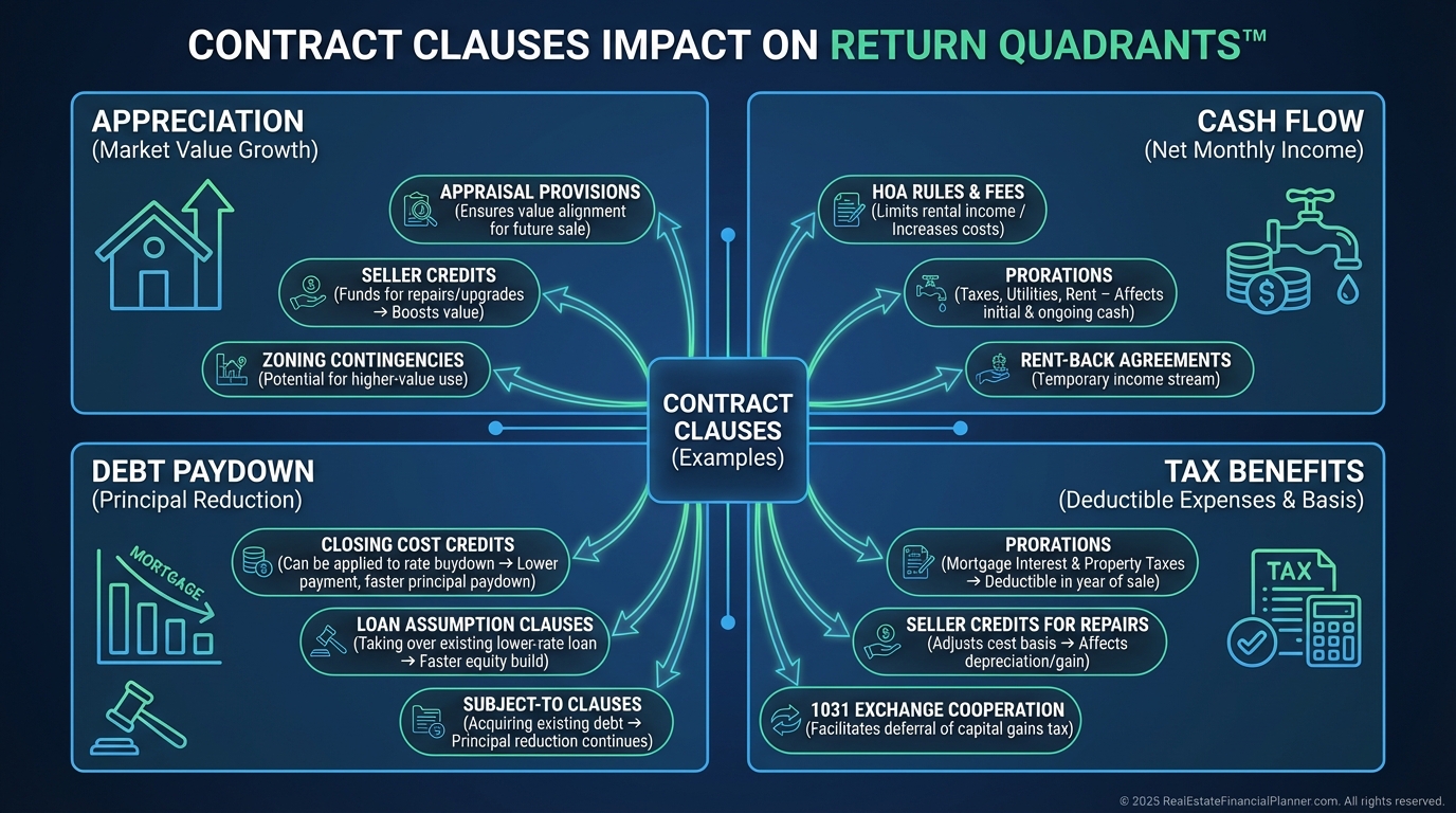 I map each clause to a Return Quadrants™ impact. Appraisal and loan terms touch appreciation and debt paydown. HOA and occupancy rules touch cash flow. Tax credits and prorations touch tax benefits.