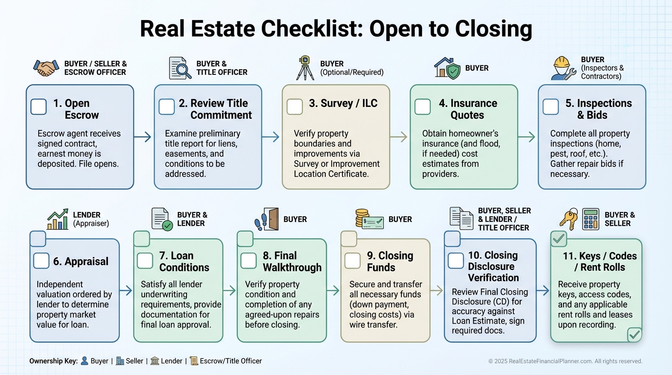 Closing and Closing Docs, Transfer of Title, Payment of Liens and Encumbrances, Closing Costs, Prorations, Possession, Damage While Under Contract, Right to Walk-Through, and Home Warranty govern the finish line. I verify prorations with actual tax rates and rent rolls.