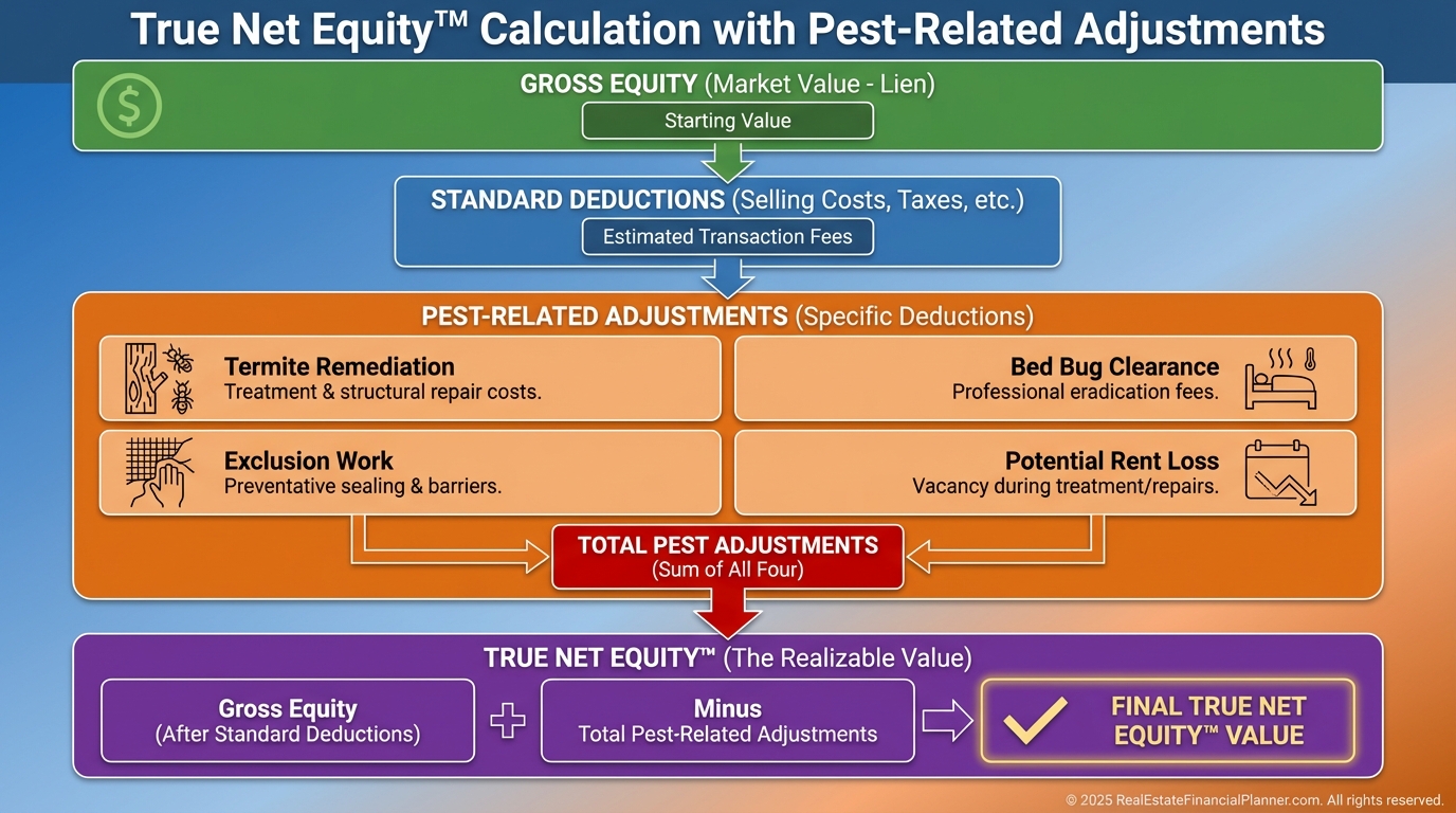 True Net Equity™ is market value minus what it would really cost to sell, fix, and make the property financeable and habitable.