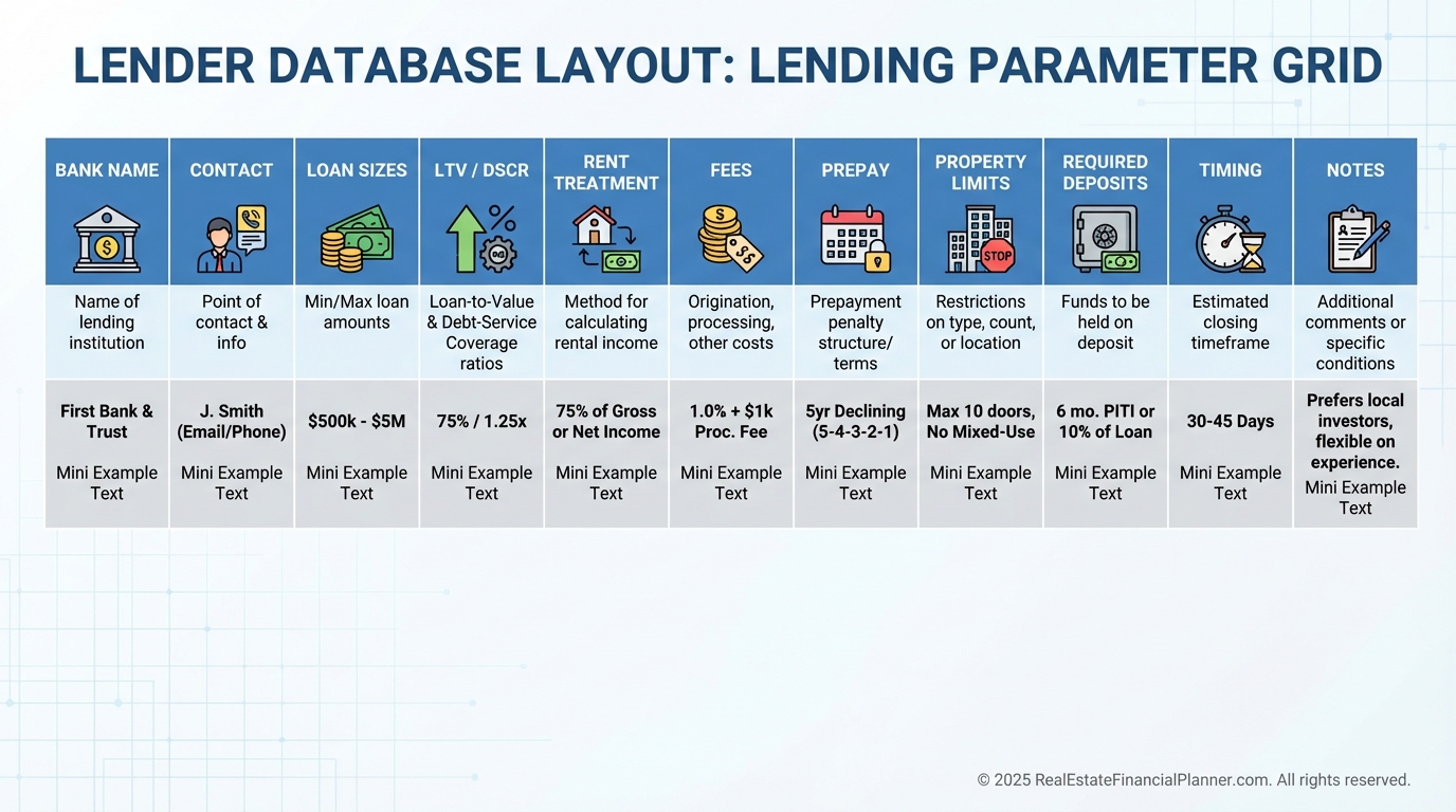 Include contact info, product notes, property-type sweet spots, LTV/DSCR norms, rent treatment, fees, required deposits, and closing speed.