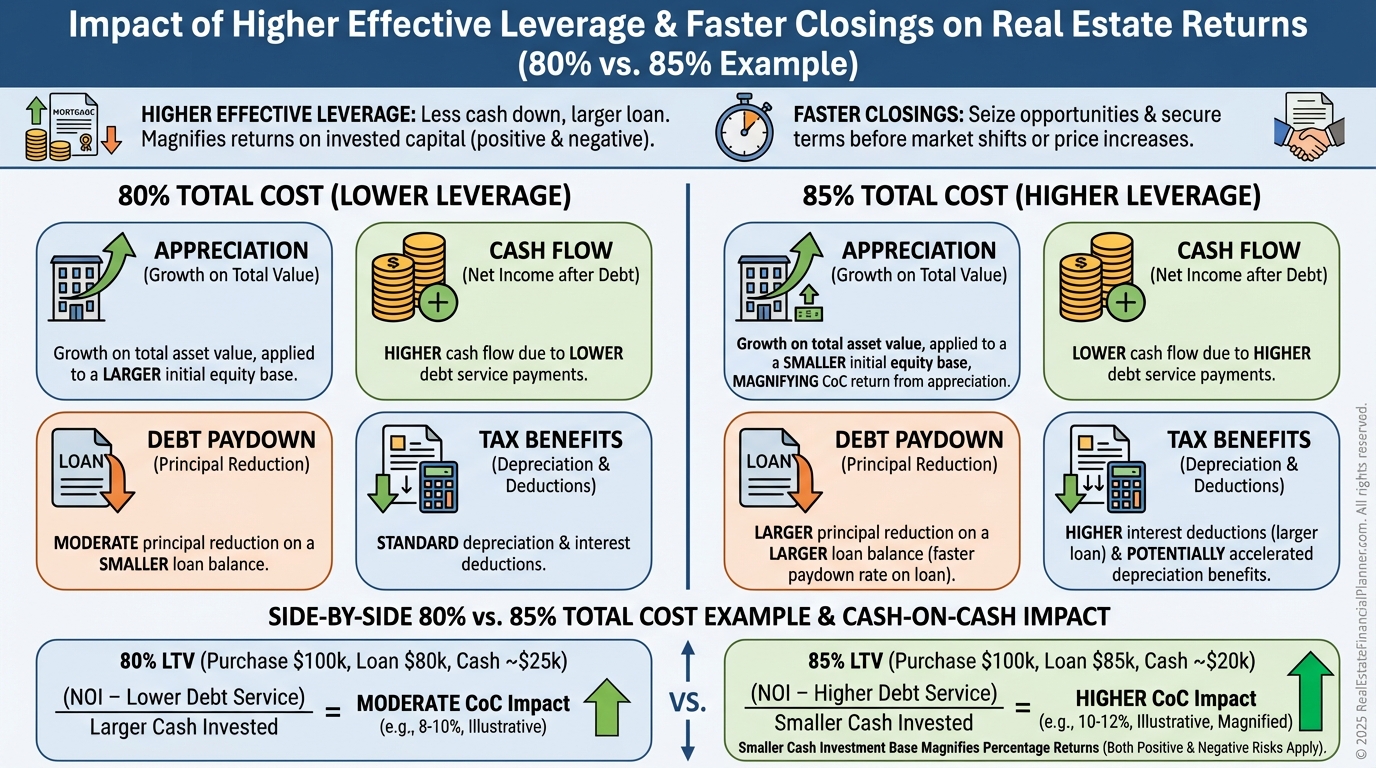 A conventional 80% LTV leaves you funding purchase plus rehab with more cash, dragging cash-on-cash.