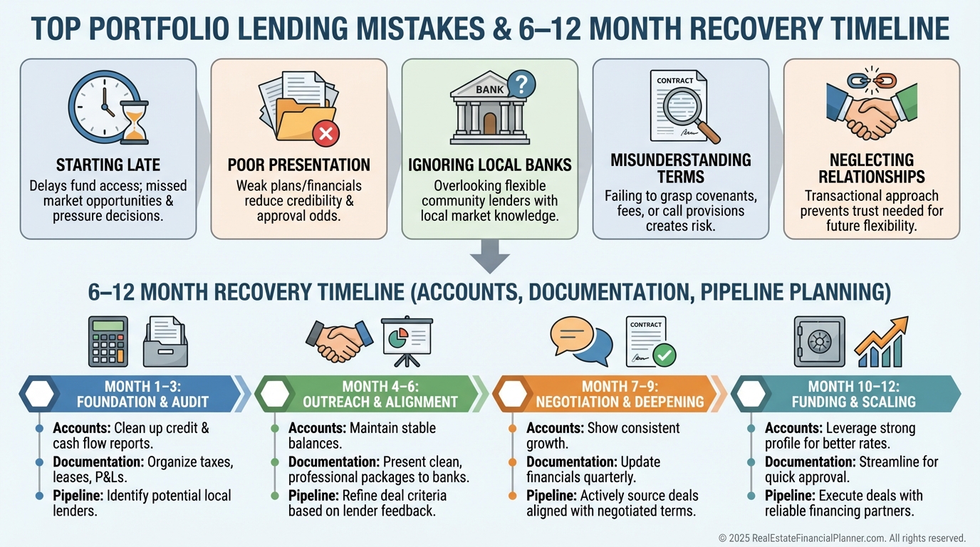 When I sit with a banker, I bring a clean portfolio summary, rent roll, Schedule E tie-outs, trailing 12s, liquidity snapshot, and business plan.