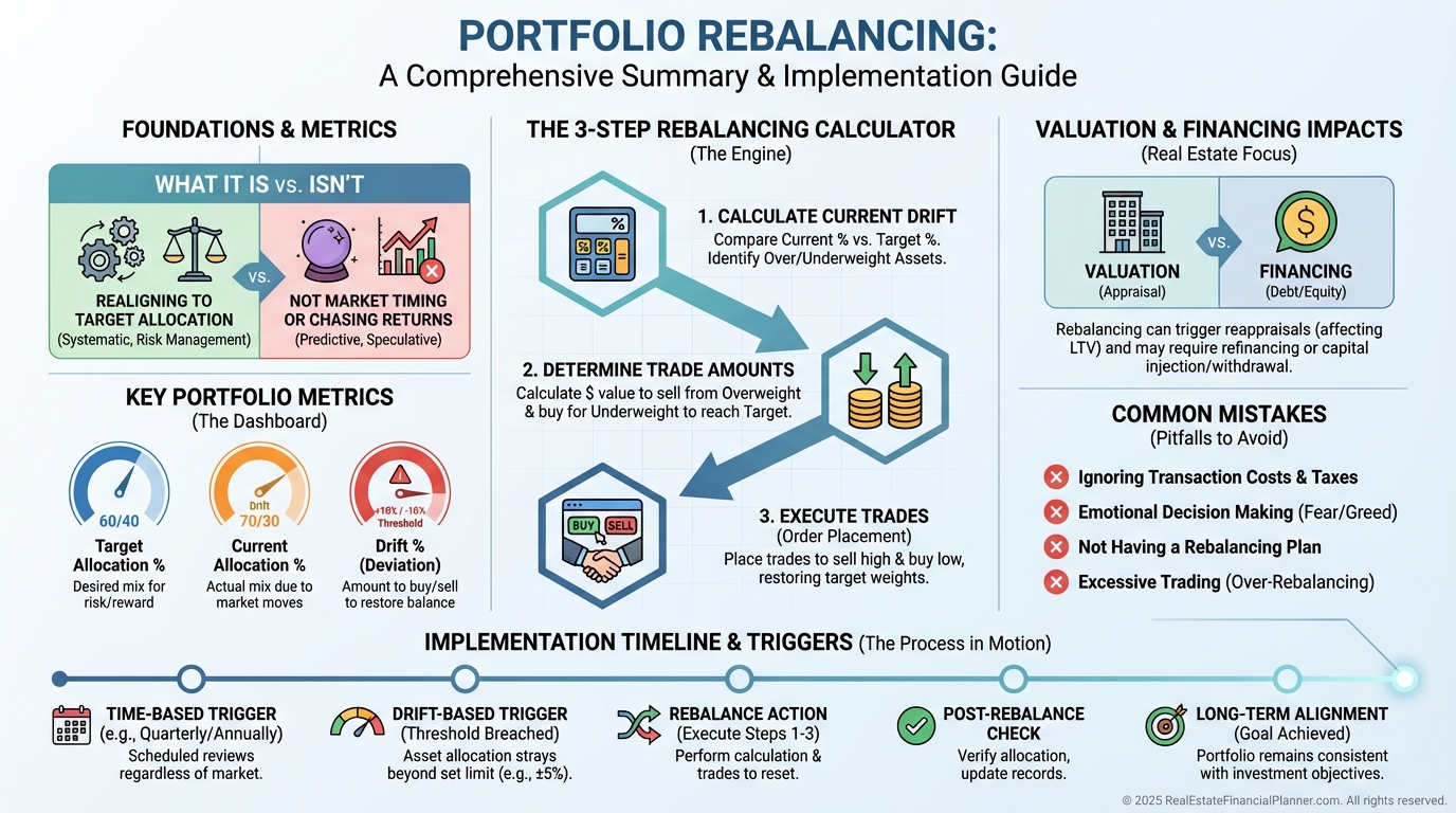 Rebalancing too frequently: Real estate friction costs are 8–10% round-trip. Annual review is usually enough.