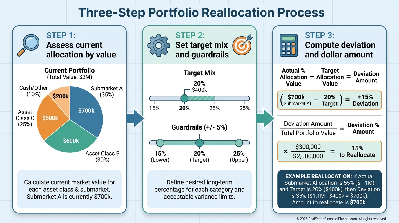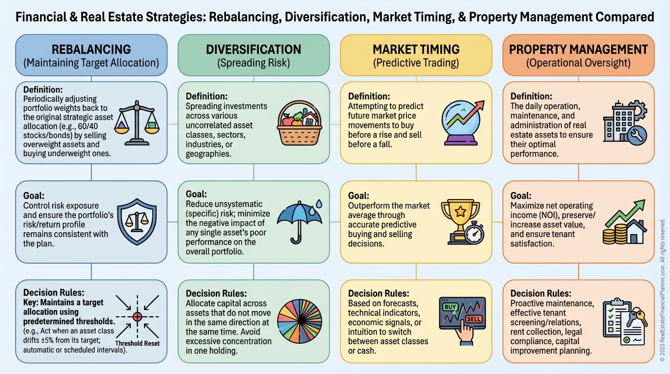 You adjust what you own so your portfolio still matches your risk tolerance, goals, and outlook as values, rents, and loans evolve.