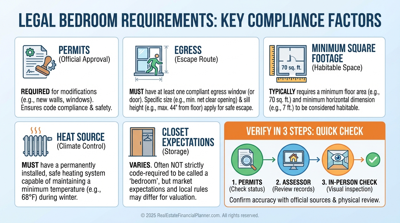 A bedroom must meet local code for egress, minimum square footage, natural light/ventilation, and often a closet.