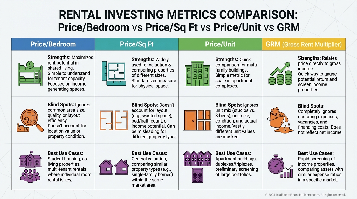 Don’t compare single-family price per bedroom directly to multifamily without normalizing.