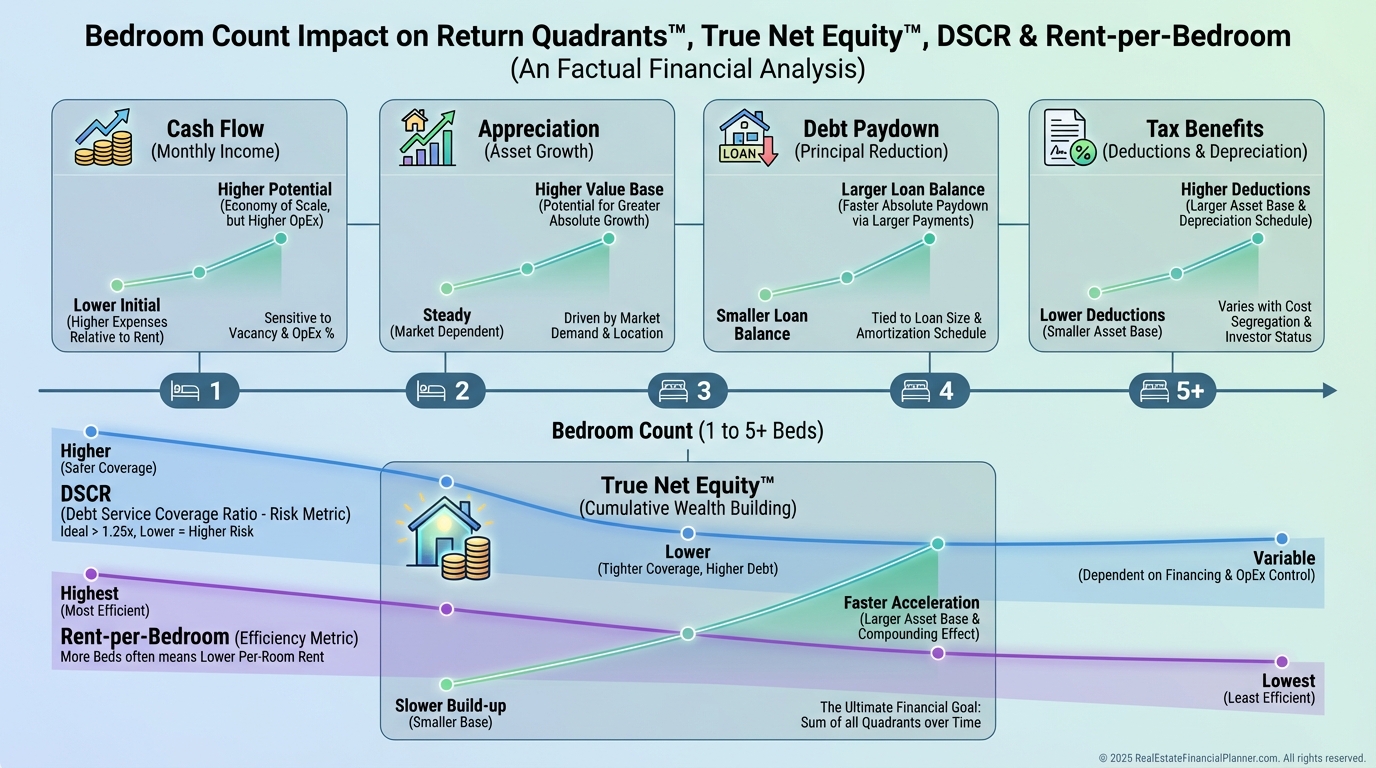 On the Return Quadrants™, more conforming bedrooms usually lift cash flow and reduce vacancy, supporting appreciation via stronger comps.