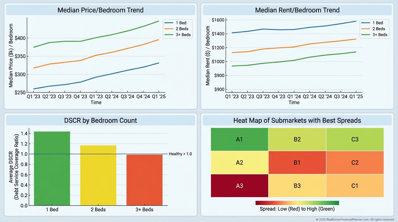 In The World’s Greatest Real Estate Deal Analysis Spreadsheet™, I monitor price per bedroom alongside rent per bedroom to sanity-check pro forma rents and DSCR.