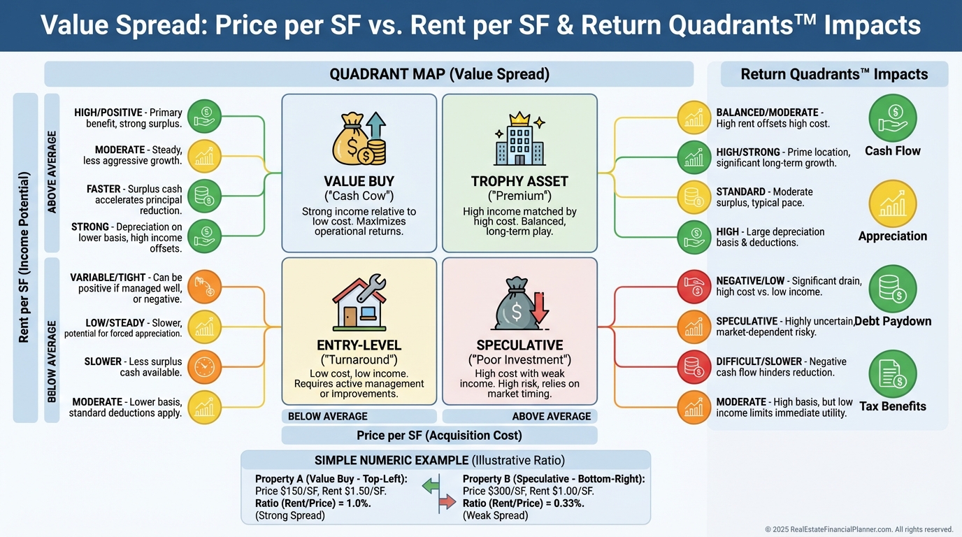 A slightly higher price/SF can still be superior if it adds a legal bedroom that increases rent/SF and accelerates your Return Quadrants™.