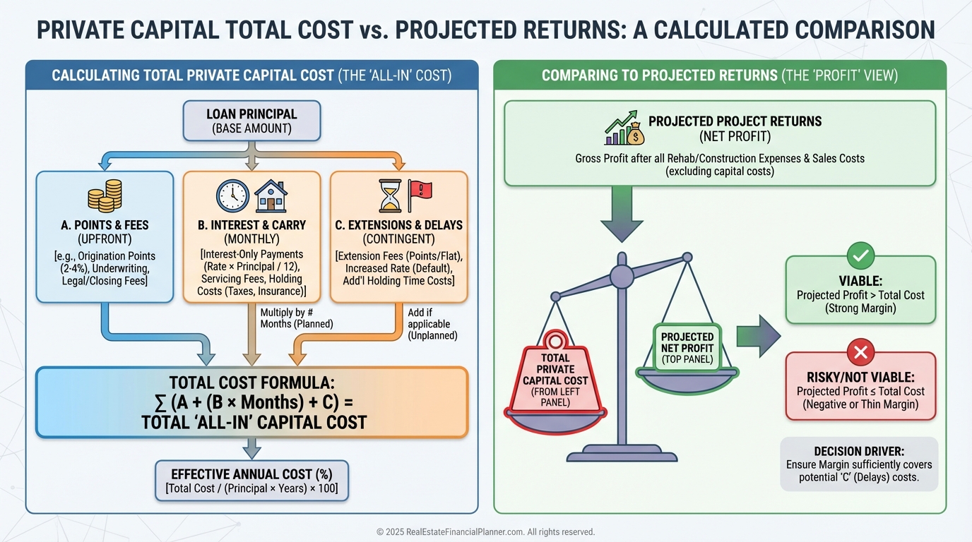 I price total cost of capital, not just rate: origination, points, junk fees, interest carry, extension fees, and cost of delays.