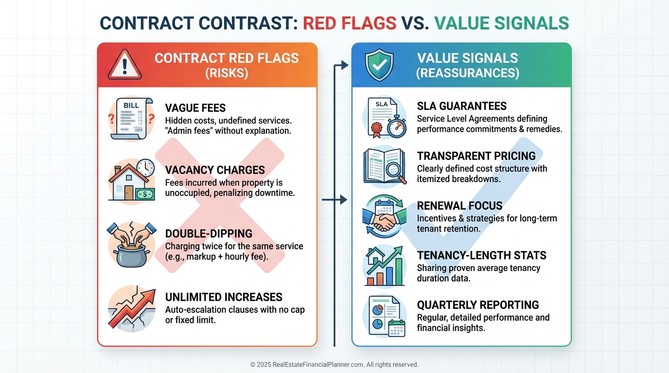 Red flags include full management fees charged during vacancy, vague fee descriptions, double-billing a service, and no cap on fee increases.