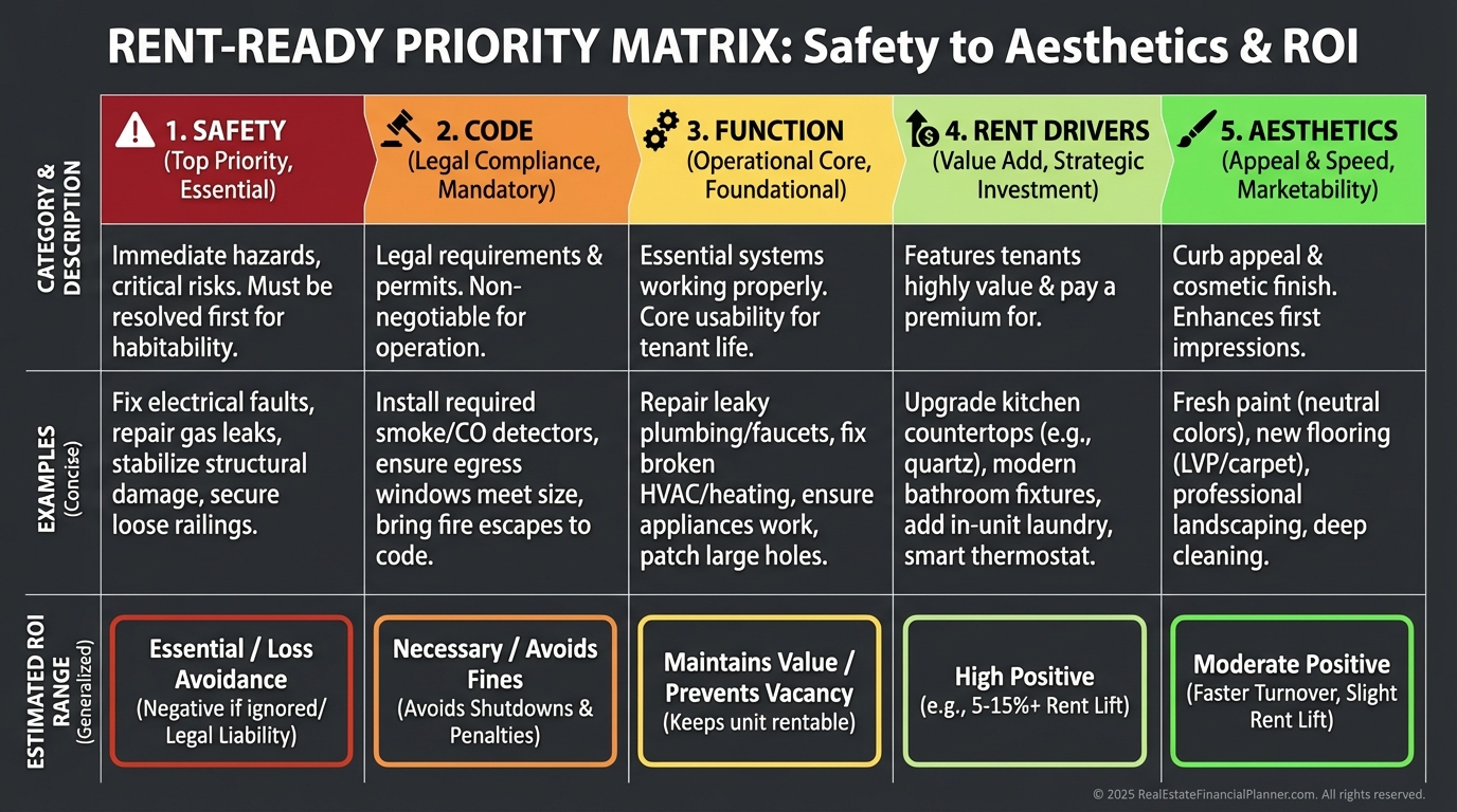 I use a simple rule with them: life safety first, code next, then upgrades that add more than a dollar of rent for each dollar spent.
