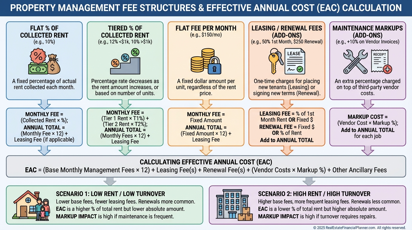 Expect a monthly management fee, leasing fee, renewal fee, setup fee, inspection fees, and sometimes maintenance markups or after-hours charges.