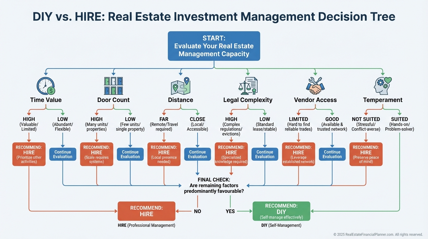 I recommend hiring when either of these is true: you’re over three doors, you live more than 30 minutes away, or your market has complex landlord-tenant rules.