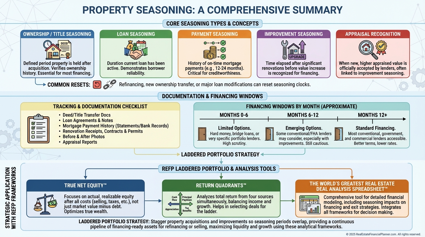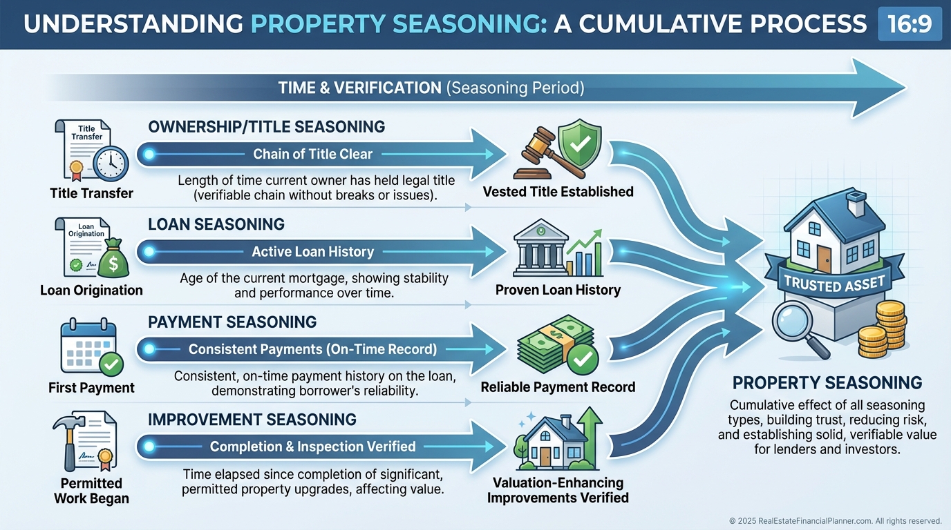 Property seasoning is the minimum time a lender or the market wants to see before recognizing your improved value or allowing certain loans.