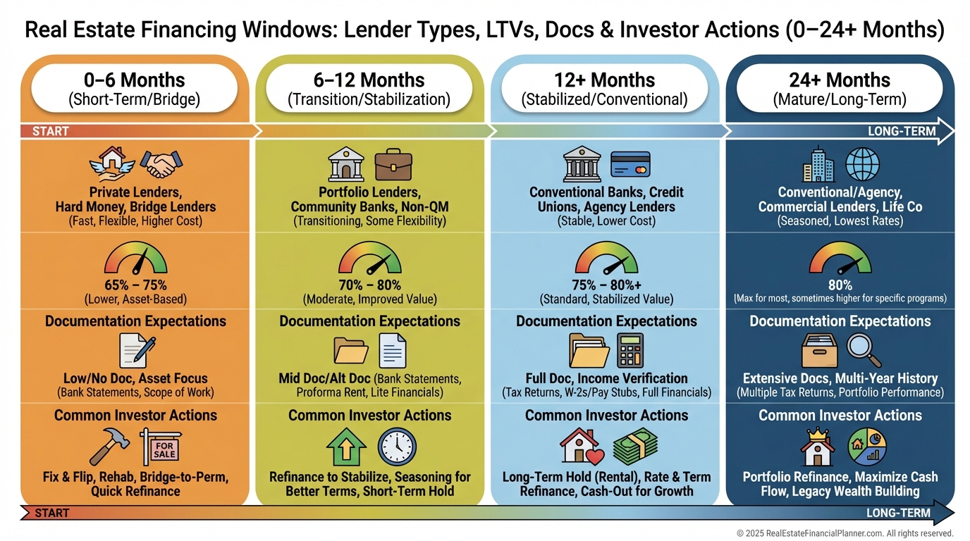 0–6 Months: Hard money, private money, some portfolio lenders. Conservative LTVs and higher pricing.