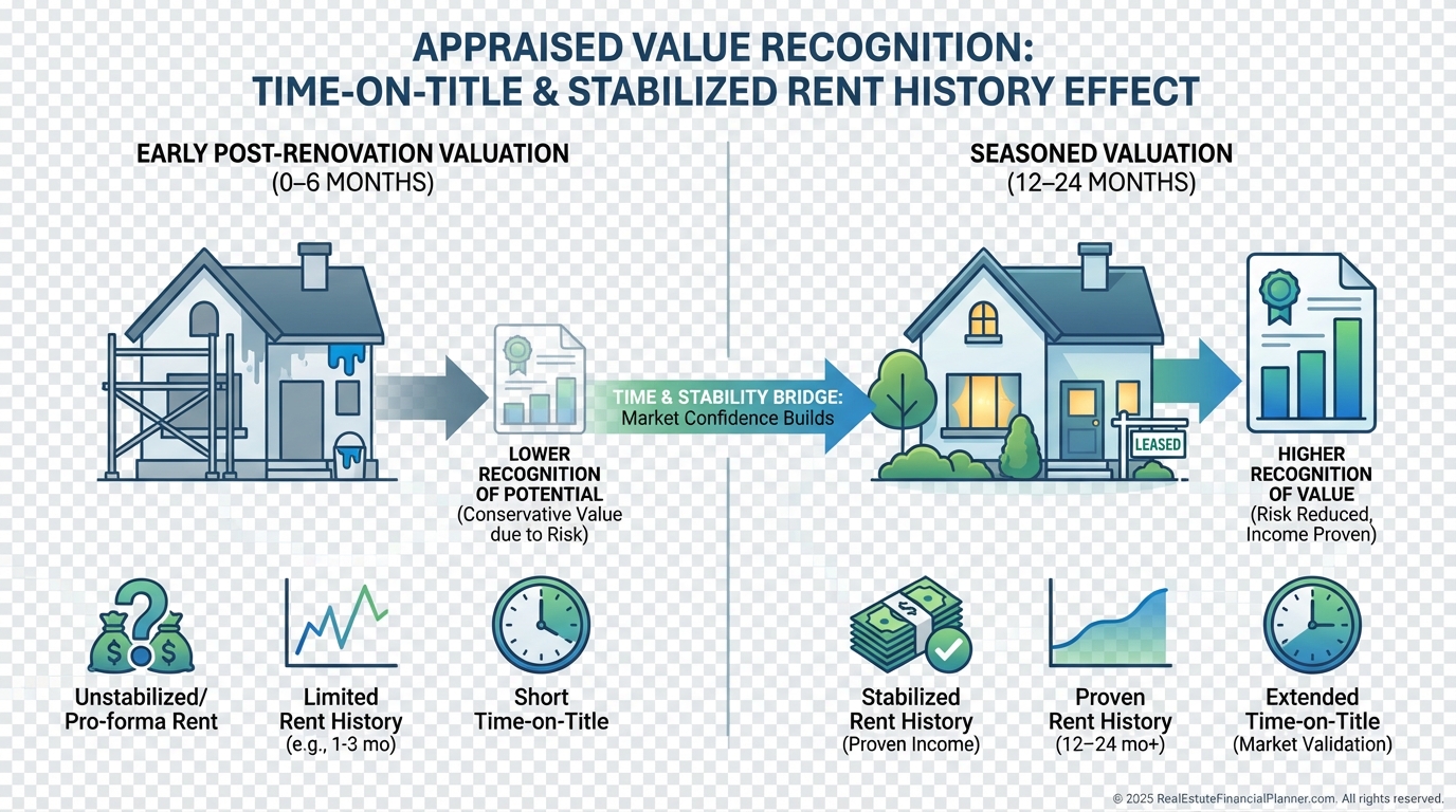 Improvement Seasoning: Time since permitted work closed and the property stabilized. Some lenders want 6–12 months before recognizing all the added value.