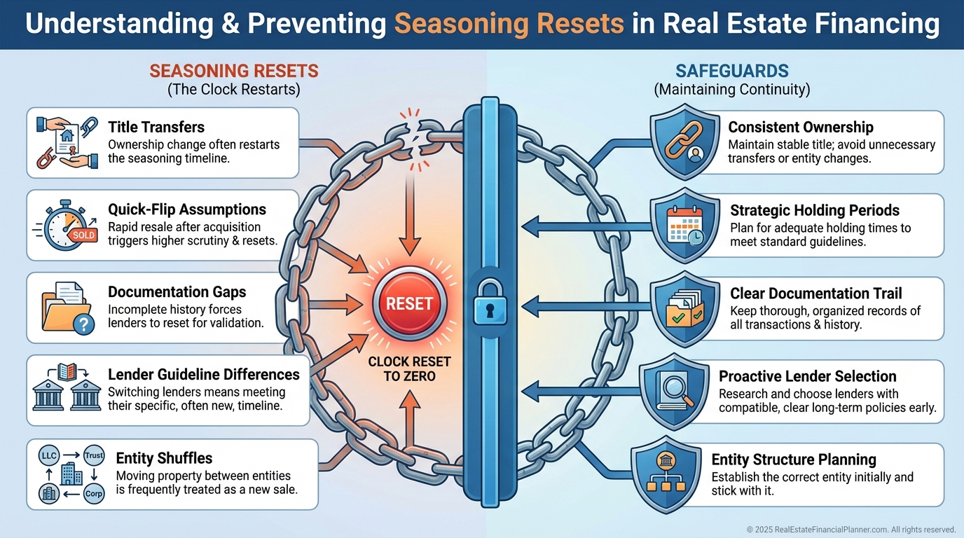 Loan Seasoning: Resets every time you refinance. This is how serial refi investors accidentally create endless waiting cycles.